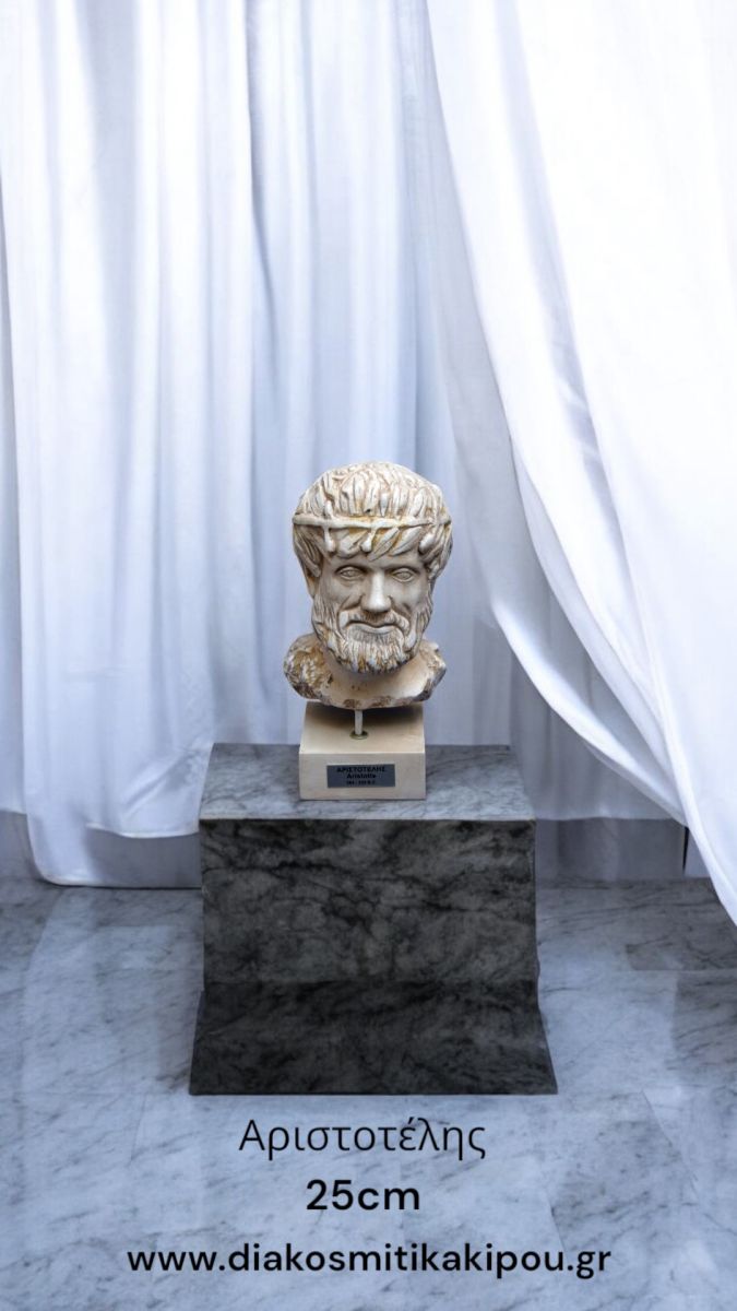 Αριστοτέλης: Αγαλματίδιο διακοσμητικό , ο Αριστοτέλης από λευκόλιθο , ύψος 25 cm .